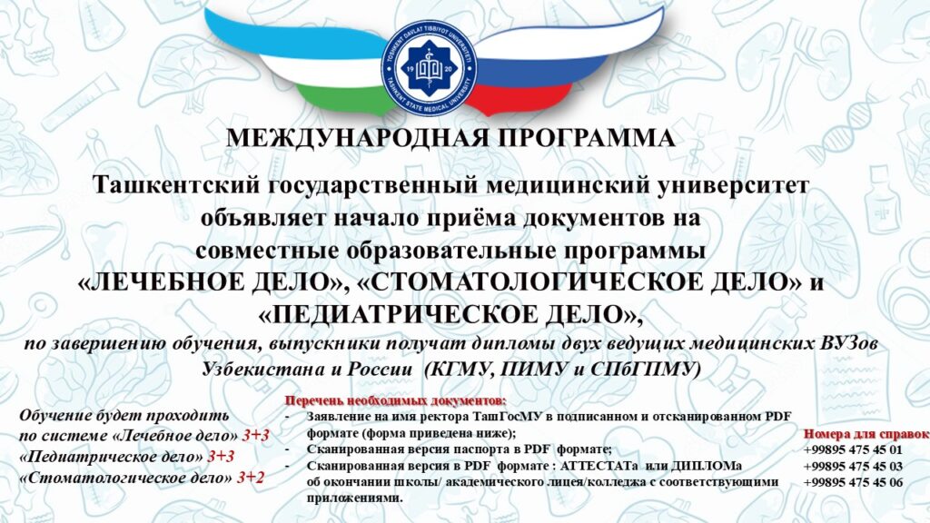 Международная программа двойных дипломов Ташкентский государственный медицинский университет совместно с ведущими государственными медицинскими университетами Российской Федерации объявляет о начале приёма документов на обучение по совместным образовательным программам. По завершении обучения студенты получают два государственных диплома — Узбекистана и России. Совместно Read more